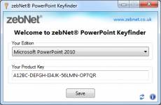Keywords: retrieve, office, powerpoint, key, product, serial, find, 2003, 2007, 2010, 2013, zebnet zebNet PowerPoint Keyfinder retrieves your Microsoft PowerPoint Product Key from your currently installed Microsoft PowerPoint edition. If needed, you can save your PowerPoint Product Key in a text file by clicking the Save button. zebNet PowerPoint Keyfinder supports Microsoft PowerPoint 2003, Microsoft PowerPoint 2007, Microsoft PowerPoint 2010 as well as Microsoft PowerPoint 2013. This application can also retrieve the product key from full Microsoft Office Suites as well as from any other stand-alone Office application. zebNet PowerPoint Keyfinder is freeware and can freely be used.