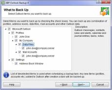 Keywords: outlook, backup, save, data, contacts, emails, transfer, move, restore, ms office ABF Outlook Backup is a handy tool to backup Microsoft Outlook. It enables user to save all important Outlook data, including email messages, contacts, mail accounts, calendar, journal, tasks and notes, rules and alerts, RSS feeds, templates, signatures and stationery. With ABF Outlook Backup user can save backed up data to local hard drive, remote computer using LAN, flash drives and even burn backup file to CD or DVD. Backup files can be protected with a password to avoid unauthorized access to private data. Also, using ABF Outlook Backup Task builder a user can easily automate backup and restore processes. ABF Outlook Backup may be easily used to migrate from one version of Outlook to another, just as to move Outlook data between several computers. Program supports all versions of MS Outlook including Outlook 97/98/2000/2002/2003/2007/2010/2013/2016. ABF Outlook Backup has well-though wizard interface, so even a beginner will easily master the program.