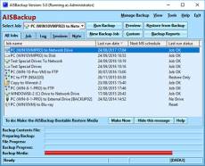Keywords: Backup, windows, pc, server, cd, dvd, usb, ftp, registry, restore, utility, disaster, recovery, external Windows PC and Server backup of selected files, folders, disks or complete systems to optical disc, external disk, network and local disks, FTP using zip file compression. AISBackup keeps track of all backups including multiple media spanning. Choose the CD/DVD/Blu-ray backup method between the integrated disc writer or a third party interface. Optional features include: Unattended scheduled backups, password protection, test backup, NTFS security settings, NTFS encrypted files, Windows server active directory SQL server etc. Backs up open and locked files, optionally limit backup to recent files. Backup jobs are created by simply clicking the source of backup and destination of backup, selected files may then be fine tuned. AISBackup only physically backs up new and changed files since the previous backup. Restore options include: Complete Windows systems, individual files and folders, 'right click' and open from backup or 'Save as' from backup and drag and drop files onto Windows Explorer. Comprehensive restore destination and duplicate file options enable disaster recovery or cloning Windows to new drives and partitions. Disk to disk copy (clone) or file and folder synchronize option. You may make AISBackup Restore media or use a compatible Windows set-up DVD (32 bit setup DVD) for disaster recovery restores.