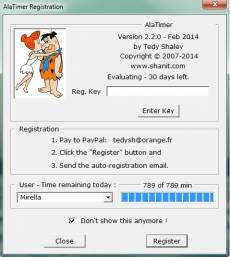Keywords: limit kids time, restrict computer time, parental control, limit time, auto logoff, reboot, restart, computer timer, limit use, access time, windows, 2K, XP, Vista, MSN, Fred, Fredy, Flintstone, play time, games, alatimer, alafredy, shanit, trial, shareware No more telling, nagging or trying to educate your children to spend less time on the home computer. No siblings' arguments: 'it's my turn now', 'you have been on it for so long...', etc. Just relax and let Fred take control. AlaTimer lets you restrict each child (Windows user) to a daily number of minutes. Sixty (60) seconds prior to this period expiring a message will pop-up, asking the user to logoff. AlaTimer could be configured to either logoff, shutdown or restart the computer, at the end of this period. Mouse hover over Fred's icon and a short message pops-up showing how long you have spent using the computer and how many more minutes are left, for the day. Click the mouse left button and the computer and Internet schedule pops up. AlaFredy configures AlaTimer - using AlaFredy a computer Administrator can read, display and/or modify all AlaTimer settings, over a (home) network, from any of the network computers. So, with AlaTimer installed on multiple computers, AlaFredy will control them all, from any remote location, as long as you are connected to the network and have Administrator's rights. Each time you attempt to modify the setup using AlaFredy, you are required to enter a password. The default password is: 'password'. You may change the password as often as needed, but please ensure you remember it. If during the day you have decided that a user requires more or less computer time, or that the Computer or Internet use schedules should change,simply run AlaFredy, on your own computer and apply any modification, as needed. Evaluate this software absolutely free, for 30 days ! Registration is per machine and there is no limit to the number of children (Windows users). You may use your bank account or a credit card and make payment through Paypal, as instructed. Please do not hesitate to contact us with any suggestions, or questions. AlaTimer was written for you. Enjoy and remember: 'Fred Flinstone loves your kids!'