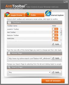 Keywords: Remove Toolbar, Toolbar Removal, Anti Toolbar, How to Remove toolbar, uninstall toolbar Anti-Toolbar will automatically detect any Toolbars installed on your PC and give you the opportunity to erase or disable them. AntiToolbar finds and displays a list of toolbars, homepage, and search settings on your browsers and then lets you choose the ones you want to remove. More than just disabling add-ons that you no longer need, AntiToolbar's intelligent technology ensures that the settings you selects remains on your PC. AntiToolbar gives you the opportunity to regain control of your Internet preferences and even boosts your browser performance. AT Identifies toolbars, homepage and search settings, Provides transparent and reversible choices, Eliminates difficult to remove add-ons and change defaults, Improves Internet experience i.e. crashes, slowness and it Support the most popular browsers: Chrome, Firefox, Internet Explorer