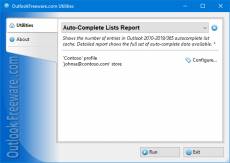 Keywords: free, freeware, outlook, add-in, add-on, autocomplete, reports This free tool reports the number of entries in Outlook 2010/2013/2016 autocomplete list cache. Detailed report shows the full set of auto-complete data available. Even if all Outlook contacts are lost or an angry employee deleted a customer base, there is another way to restore important contacts. Every time you send a message, Outlook stores selected recipients in Auto-Complete Lists and keeps them there, until they are deleted manually. These data are not available anywhere else, and many users are unaware this is not the Outlook contacts, but individual data. This report shows the number of contacts in AutoComplete lists for all connected mailboxes and accounts in Outlook 2010 and above. In advanced mode, the report shows all contacts for each account in your Outlook profile: name, email address (including X.500), and other fields. The creation of this report is the easiest way to save all the information from the Auto-Complete Lists to a CSV file. The result is a ready-made contact list you can open in Excel, edit, and import back into Outlook contacts. This is an easy way to restore contacts with email addresses from AutoComplete Lists in case of loss of the contact list. The utility can be useful in investigations and security audits. Auto-Complete Lists are stored inside the mailboxes, and there are no standard Outlook tools for viewing or editing them. Even if users delete all messages and contacts, they often forget about Auto-Complete Lists, which clearly shows recent recipients. If you don't want to leave any contacts on the computer, run this report, and make sure you haven't forgotten to delete anything. Command line allows you to export Auto-Complete Lists from PST data files and mailboxes of other users in bulk.