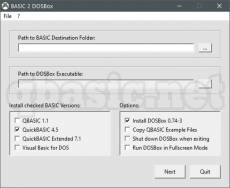 Keywords: QBasic, QuickBasic, Compiler, Interpreter, DOSBox This handy tool copies the selected versions of BASIC (QBasic 1.1, QuickBASIC 4.5, QuickBASIC Extended 7.1 and/or Visual Basic for DOS) with just a few clicks to your hard drive and creates configuration files and shortcuts. Ready to use with DOSBox! BASIC 2 DOSBox should run on all modern Windows OS's (both x86 and x64), such as: Windows XP, Vista, 7, 8, 8.1 and Windows 10 Tested with these OS's: Windows XP Professional Service Pack 3 (x86) Windows 7 Ultimate Service Pack 1 (x86) Windows 10 Pro Version 2004 (x64) BASIC 2 DOSBox v1.2.0 - new features and bug fixes (2021-03-17): Added: Optional inbuilt DOSBox Installation Fixed: Whitespace issue in Folder Paths Fixed: Possible issue with slashes while unzipping