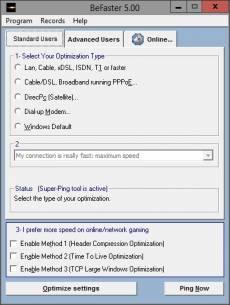 Keywords: befaster, optimize, connection, modem, speed, registry, cable, dsl, satellite, direcpc, isdn, t1, fast, internet, accelerator, boost, broadband, network, lan, wan, ping, mtu, performance, adsl, tuning, tweaker, optimiser, tweak, bandwidth, improve BeFaster is a multi-language internet speed up toolkit with some powerful tools. It makes optimization easier with better support and improved compability. It optimizes all kind of connection types: Lan, Wireless, Cable Modem, xDSL (ADSL, VDSL, etc) , ISDN, T1, DirecPc (Satellite), Dial-up modem, 3G Mobile, Cable/DSL running PPPoE or PPPoA etc. and AOL, Symantec PcAnyWhere, IE, Opera. You can configure settings manually or program can automatically configure them for you. You can optimize your online/network gaming speed easily. Its Super-Ping Tool prevents connection drops and its Ping Now Function awakes suspended modems. Easier and better with multi-language support (over 27 languages). Its live update property will make you informed about the new versions or updated files. You can share your custom settings with your friends by using Records Function. This program is designed for Windows.