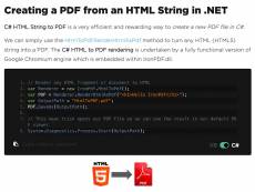 The C# and VB.net HTML to PDF tutorial with code examples for the IronPDF .Net PDF software library. Tutorial to show how to Convert, edit, create, generate PDF documents from HTML files in .Net desktop, web and console applications, inc. HTMLtoPDF convertor and generator