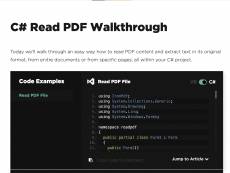 Keywords: c# read pdf, read pdf c#, read pdf in c#, pdf reader c#, c# pdf reader c# read pdf text, c# read pdf file contents, read pdf file in c#, c# read pdf file to stream, read pdf using c#, c# read pdf table, how to read pdf file in c# You can use the arc PDF document.load functionality within IronPDF to parse a PDF file, and then read its contents. Some of the most common operations people form are extracting indexable plain text from a PDF, and also extracting images from a PDF. You may extract embedded images or render an entire PDF as image files. Using the PDF document dot extract text from page method allows us to accurately extract UTF eight or other encoding text from a PDF document so that it can be extracted and used for other applications. It is often used for indexing PDFs within search engines. IronPDF exposes the PDF document.extract images from the page method. Doing so allows us to extract any embedded images from a PDF. In addition, we also have rendering or rasterizing functionality allowing any existing PDF to be turned into image files rendered page by page which are verbatim identical to the original PDF document. Can IronPDF read the text out of images embedded in PDFs? IronPDF is not an OCR library. We suggest you useIronOCR, our sister product for extracting text from images and PDF files. Do our maker tools OCR the text from images inside a PDF file? Yes, IronOCR is an advanced PDF OCR Technology Building upon Tesseract, allowing PDF files to be turned into plain text whether or not the content is embedded as PDF text objects or within images. It is perfect for extracting test text from PDF scans. Can I read a PDF in C# to a string? Yes. PDF can be read to and from streams using IronPDF. The from stream functionality and the stream property of the PDF document allows you to save to and from streams. Any type of stream. File Stream, memory stream, every type of stream supported by .Net. Are there other ways to read PDF file contents on IronPDF? Well we can already read PDF file contents from streams and from files. We may also wish to extract them from byte arrays, something IronPDF fully supports. It is a comprehensive C# PDF reader.