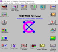 Keywords: chemix, chemistry, software, school, concentration, dilution, educational, curve fit, plotter, molecular 3-D viewer, gas equations, periodic table, conversion, weak, acid, base, pka, buffer, pkb, solublity, ksp, nmr, ir, ms, spectroscopy, lessons, calculator, function, stoichio CHEMIX School is an educational tool for learning chemistry. It is geared toward college-level chemistry, but is also appropriate for high-school students, chemists, and teachers. It is equipped with a periodic table containing history, 19 physical properties + number of stable isotopes, abundance, atomic mass, spin, resonance frequencies, relative receptivity, magnetic moment, quadropole moment and magnetogyric ratio for all stable isotopes. Also included are physical properties of more than 2500 unstable isotopes such as: atomic mass, half-life, decay modes, decay energy, particle energy, particle intensities,spin and magnetic moment including decay trees for 600 decays. Search Inorganic Compounds - physical properties/constants. Search thousands of inorganic compounds offline. It is also equipped with a molecular 3-D viewer, calculator, curve fit, function plot, data manipulation, derivatives, definite integrals for one and two functions, ternary phase diagram plotter, binary phase diagram plotter, trend plots of physical/chemical properties of the elements, spline interpolation, conversion table (temperature, pressure, energy, power, length and mass), solubility chart for inorganic compounds used in inorganic analysis, Solubility curve plotter and temperature/solubility Calculations by interpolaton, dictionary, and advanced calculators for concentration, dilution, molecules (Mol, mass and mass%), thermochemistry , electrochemistry, weak acid/base/buffers, acid-base indicators table, solubility (Ksp) and common ion effect calculator, gas equations, spectroscopy assignment tool (NMR H[1] C[13], IR and MS) and stoichiometry (chemical equation balancer that also balances chemical equations containing free electrons). Ability to insert colors and angled text in graphics. Hi resolution print and copy to clipboard. Chemistry lessons and problems are included. Both English and Norwegian versions are available