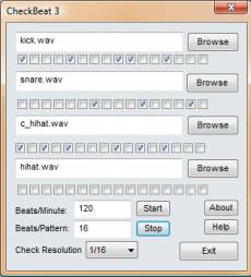 Keywords: drum, machine, sampler, beat, drumbeat, wave, wav, drum machine CheckBeat is a virtual drum machine designed for quickly creating simple beats. It can be used like a fancy metronome and is handy when you need to create a backing beat for a drummer-less jam session. Programming a beat is as simple as clicking a few checkboxes. It plays sound using .wav files, so you can use the built-in drum sounds, or any sound you can dream of. You can set the note length (check resolution) of the checkboxes and can set the tempo pretty much any number of beats per minute. You can also use less than the full 16 checkboxes in the pattern if you want to create a beat in a different time signature like 5/4 or 9/8. CheckBeat was written using XAudio2, so you will need to have the Microsoft DirectX runtime installed.