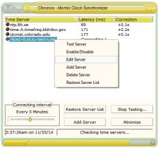 Keywords: atomic, clock, time synch, astronomy, time, servers, ntp, synchronize, network, time Chronos Atomic Clock Synchronizer is a utility for people who need their computers to use exact time. The program connects to various atomic clock timeservers and synchronizes your internal clock with time provided by these servers. Key benefits: Connects on many atomic clock time servers; You can add any time server needed; Improved algorithm to calculate differences between servers; Calculates delays and synchronize on less than 0.1 seconds. Some other features: Starts up automatically minimized to the tray; Updated server list; Shorter latency time for synchronizing; Faster connection to the sync servers.