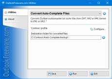 Keywords: free, freeware, outlook, add-in, add-on, autocomplete, convert Free, easy and fast way to convert Microsoft Outlook auto-complete list cache files from NK2, DAT and XML to XML and NK2 formats. Automatically detects autocomplete cache files used by Outlook and allows you to specify custom location for these files. This tool can be utilized to transfer, migrate, backup and edit Outlook auto-complete lists. Binary NK2 files is a convenient way to transfer or migrate while the XML text files are easy to backup and edit in any text editor. For your convenience Outlook add-in allowing to run the tool right from Outlook and standalone launcher application allowing to run the tool without the need to start Outlook are included in the product.