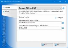 Keywords: free, freeware, outlook, add-in, add-on, eml, msg, convert Free and easy way to convert message files from EML to MSG format that is native to Microsoft Outlook. It is possible to retain the original folder structure: specify folder containing files and subfolders with files in EML format, target folder for resulting MSG files and run the utility. You will get all your converted messages placed according to the source folder structure. Support for old ANSI and modern Unicode MSG formats provided. This utility can also be used to convert messages from Windows Live Mail, Mozilla Thunderbird and other email clients that use EML format to save email files. The product provides both standalone application and Outlook add-in.
