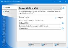 Keywords: free, freeware, outlook, add-in, add-on, mbox, msg, convert This free utility quickly and easily exports email messages from MBOX message database files to MSG format files used by Outlook. Then, you can import them into Outlook, work with them in Windows Explorer, do a search, send to other users, or simply keep a backup in native Outlook form. MBOX format files are inconvenient for storing email message databases. These files cannot be opened in Outlook; there are no standard Windows tools for browsing and searching them. MBOX files do not support keeping the folder structure each folder requires a separate file. In addition, the MBOX files can be very large, creating additional inconvenience and reducing the reliability of your email backups. This program converts MBOX files of any format (mboxo, mboxrd, mboxcl, mboxcl2 and others) to Outlook MSG files. The utility can convert multiple files at once, retaining the original folder structure on your disk or network share. In addition, the tool saves all key message headers, so you can see them in Windows Explorer, selecting the appropriate columns. You can use Windows Explorer's built-in functions to search MSG files. You can also open MSG files directly in Outlook. To automate the conversion of many MBOX files in different folders, the command line is provided by the product. By creating the required scripts and batch files, you can implement scenarios for converting MBOX to MSG of any complexity.