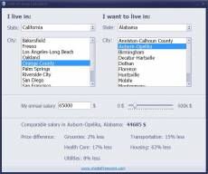 Cost of Living Calculator is a must-have application for those who are going to move to another city in United States developed by Free Payment Calculators. It's a desktop application which gives you some essential information about other cities costs such as Groceries, Health Care, Utilities, Transportation and housing costs. It's a simple calculator which compares different living costs in source and destination cities in the United States. You can select your current city and the city you are moving to and the application does the rest. You can see the result in a percent of source city's costs. For example it shows that the costs for Health Care in city A is 20% greater than the city B which you are moving to. Comparison is done based on your annual salary which is a good calculation reference. The application is very simple and no annoying additional and unnecessary information is shown or is needed. Just select your city and enter your salary. The main features of Cost of Living Calculator are: Cost of living calculation for essential parameters; Does all comparisons based on city and annual salary amount; Comparison results are sorted into different fields such as Groceries, Health Care, Utilities, Transportation and Housing costs.