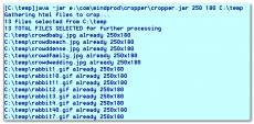 Keywords: cropper, common size, png, jpg, jpeg, gif, scale, cropy Converts set of jpg, jpeg, png or gif images to a common size e.g. for an animated gif. Crops and scales images to a common specified size. Java source included. To convert a single file, type: java.exe -jar C:\com\mindprod\cropper\cropper.jar 200 300 rabbit.gif where 200x300 pixels is the desired size. The results replace the old file, so you had better make a backup just in case this is not what you want. You can also list several files on the command line: java.exe -jar C:\com\mindprod\cropper\cropper.jar rabbit.gif C:\mydir\cat.png To use convert the current directory of jpg, png and gif files: java.exe -jar C:\com\mindprod\cropper\cropper.jar . to convert a whole directory tree of images: java.exe -jar C:\com\mindprod\cropper\cropper.jar -s E:\imagedirs Sorry no wildcards, just . , and .. DON'T USE WILDCARDS unless you deeply understand how they work. Windows expands them, not cropper, and feeds them to cropper (or any other program) as a giant list of all the directories and files in the current directory. Cropper will thus tend process all the files in your directories, when you just meant to process the files in the current directory. If you have the jar extension set up as executable, you can abbreviate: C:\com\mindprod\cropper\cropper.jar .