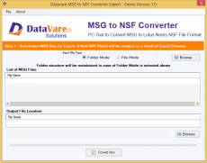 Keywords: bulk import msg file into nsf, msg to nsf converter, export msg to nsf, import msg to nsf, convert msg to nsf file, msg to nsf, msg2nsf converter Datavare MSG to NSF Converter is a brilliant application that will convert MSG files to NSF file format. It can smartly load multiple MSG files at once to export into NSF file format. No Outlook installation is mandatory for the conversion of MSG files to Lotus Notes NSF file format. However, Lotus Notes installation is necessary for exporting MSG files to NSF file format. You can load MSG files of all Outlook editions like Outlook 2019, 2016, 2013, 2010, 2007, etc. and import them successfully into Lotus Notes 10.0, 9.0, 8.5, 8.0, 7.0, 6.0, and below versions. No disturbance is made to original folder structure and email attributes like subject, date, time, from, cc, bcc, to, hyperlinks, and others. All items are well preserved within MSG emails while exporting into Lotus Notes NSF file format. Using Folder mode, one can comfortably load MSG folder to export into NSF file format. Selective MSG files to NSF conversion is performed by the software. Users are free to set the location for NSF file of their choice. In 4 easy steps, the conversion of MSG emails to Lotus Notes NSF file format is carried out by the software. Datavare MSG to NSF Converter can be downloaded on any Windows version and the conversion is performed smoothly on all the latest and previous Windows editions i.e. Windows 10, 8, 7, XP, Vista, and others. Users can evaluate the software with freeware MSG to Lotus Notes Converter that will export first 10 MSG files into Lotus Notes NSF file format.