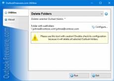 Keywords: free, freeware, outlook, add-in, add-on, folders, delete This free utility deletes selected Outlook folders and/or subfolders. To delete many folders or subfolders in Outlook, Exchange Server, and Office 365 mailboxes and public folders, simply select the folders you want and run the utility. Deleting can be safe - all deleted folders are moved to the "Deleted Items", preserving the structure. If necessary, you can choose to permanently delete folders. Key utility benefits: - Safely removes all selected Outlook folders or Exchange Server public folders at once. - Can delete all selected Outlook/Exchange/Office 365 folders permanently. - Deletes subfolders of the selected folders. - Provides the ability to run directly from Outlook or use a standalone application. - Command line support enables you to delete folders and subfolders from batch files and scripts. The command line tool allows you to delete Outlook/Exchange folders and subfolders in batch files, scripts, Windows Task Scheduler, and other scenarios.