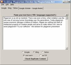 Company: Plagiarisma.Net Country: Ukraine, UA, Kyiv ASP member: No Company Web site: http://plagiarisma.net Application info: http://sourceforge.net/projects/plagiarism/ Author: Eugene Ekimov Sales email: info@plagiarisma.net Support email: info@plagiarisma.net License type: Freeware Class: Education::Teaching & Training Tools Specific: Education Categories: Education :: Language, Education :: Teaching, Home & Hobby :: Education, Internet :: Tools & Utilities Platform: OS: WinXP, Win7 x32, Win7 x64, Windows 8, WinServer, WinVista, WinVista x64 System requirements: Windows XP or later, Internet Explorer Language: English Limitations: No limitations for premium members