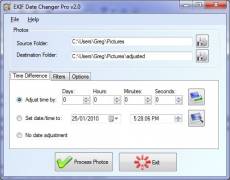Keywords: EXIF, Date, JPG, Digital Photo Time, Correction, Update time, RAW, adjust Exchangeable Image File (EXIF) data is stored within JPEG images. Almost all digital cameras record and store the cameras settings, scene information, date/time the photo was taken etc within this EXIF data. This information can be really useful when it comes to sorting and viewing your digital photos, providing you keep the date and time settings of your camera up to date. While traveling this rarely happens, making the date/time values useless. EXIF Date Changer modifies the date and time attributes of the EXIF data in your digital photos. This allows you to compensate for incorrect camera settings, or different time zones within seconds. As an added bonus you are also able to rename all photos to include the time taken in the filename, making it even easier to sort and view your photos.