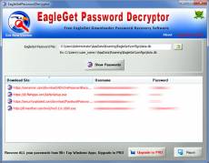 Keywords: eagleget password, eagleget password recovery, find eagleget password, eagleget password tool, recover eagleget password, lost eagleget password, eagleget downloader password EagleGet Password Decryptor is the FREE software to instantly recover download site login passwords from EagleGet Download Accelerator. Here are the key benefits for you * Instantly decrypt and recover stored download site passwords from EagleGet Downlaoder. * Recover all stored passwords of any length and complexity. * Automatically detect EagleGet Password database file. * Easier and faster to use with its user friendly cool GUI interface. * Save the recovered password list to HTML/TEXT/XML/CSV file * Support for local Installation and uninstallation of the software. EagleGet Password Decryptor works on both 32bit & 64 bit platforms starting from Windows XP to latest operating system, Windows 10.