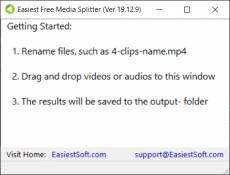 1. Rename the video to start with 'number-clips', for example, '4-clips_name.mp4' 2. Run Easiest Free Media Splitter 3. Drag and Drop the video/audio into the software window 4. The output clips will be saved to the folder 'output-4-clips_name'