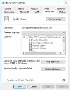 Keywords: Office, 365, Active, Directory, Email, Licenses, Azure, proxyAddresses, Mailbox, Size, Limit, Forwarding, Delegation, Administration, Management, Calendar, Permissions, Exchange, Online, Outlook, Automapping EASY365MANAGER IS AN EASY-TO-USE PLUGIN FOR ACTIVE DIRECTORY USERS & COMPUTERS Manage email properties, Office 365 licenses, and Office 365 mailboxes directly from AD Users & Computers. Stop switching between numerous web consoles and PowerShell. Remove your on-premises Exchange Server. Perform the following Office 365 tasks directly from Active Directory Users & Computers: Create new Office 365 user mailbox Create new Office 365 shared mailboxes (without on-prem to Office 365 migration) Create new Office 365 room or equipment mailboxes Convert mailbox type (user, room, equipment, or shared) Create mail-enabled users in Office 365 (users with external mail addresses) Configure distribution groups Configure mailbox aliases Configure calendar permissions Configure Outlook automapping Configure save to sent-items for send-as and send-on-behalf Hide the mail address from address lists See the mailbox usage Edit storage limits Enable forwarding (configure delivery options) Set delivery restrictions (approved or rejected senders and message size limits) Assign access permissions (mailbox delegation) Force Azure AD Connect synchronization to Office 365 (one-click synchronization) Bulk edit Office 365 properties from Active Directory Users & Computers Copy user properties based on Active Directory template (right-click & copy user) Set or change the user picture in Office 365 Set the preferred language in Office 365 Assign/remove Office 365 licenses or service plans View number of used and available Office 365 licenses Edit proxy addresses, including Remote Routing Address Edit custom attributes (extensionAttributes) Delegate access to Office 365 calendars (Reviewer, Author, Editor, etc.) We welcome your request for further extensions