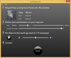 Keywords: iPhone, Ringtones, Create ringtones for iPhone, ring tones Create ringtones - EasyRingFoundry allows you to create ringtones for your iPhone in just a few clicks. Use any mp3 sound - EasyRingFoundry creates ring tones from any unprotected sound available on your iTunes software - music, voice, noise, ... Customize - Chose the starting point and duration of your ringtone. Compatibility - EasyRingFoundry is compatible with any version of Windows from Windows XP up to Windows 8. Free trial - Download and try EasyRingFoundry for free!!! Available in English, French and German