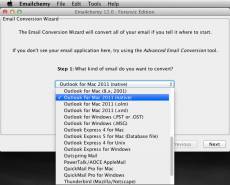 Keywords: convert email, email converter, email, migrate, outlook, entourage, claris, import, export, e-mail, mail, mbox, maildir, pst, pfc, aol, eudora, compuserve, thunderbird, quickmail, netscape, opera, mozilla, maccim, converter, migration, IMAP, POP3, em Emailchemy converts email from the closed, proprietary file formats of the most popular (and many of yesterdays forgotten) email applications to standard, portable formats that any application can use. These standard formats are ideal for importing, long term archival, database entry, or forensic analysis and eDiscovery. - Converts proprietary email formats to the official Internet standard format for maximum compatibility - Convert all your old email files with a single product with a cross-platform solution that runs on Windows, Mac, and Linux - No need to re-install or run old email programs - Convert Windows email files on a Mac or Linux computer, and vice-versa - Industrial-strength accuracy relied upon by law enforcement and forensic agencies - Embedded IMAP email server to simplify importing - Utilities for splitting, sorting and merging email archives, and harvesting email addresses Emailchemy can read: AOL for Mac (v3 and newer) AOL for Windows (PFC files) AOL Desktop for Mac Apple Mail Claris Emailer for Macintosh CompuServe Classic for Macintosh (MacCIM) CompuServe for Windows Entourage (Database, .RGE and cache files) Eudora Mozilla Mulberry Musashi Neoplanet Netscape Opera Outlook for Mac (8.x, 2001, 2011, 2015, 2016) Outlook for Windows (MSG, PST and OST files) Outlook Express for Macintosh Outlook Express for Windows Outlook Express for UNIX/Solaris Outspring PowerTalk/AOCE for Macintosh QuickMail Pro for Macintosh QuickMail Pro for Windows Thunderbird Windows Live Mail Windows Mail Yahoo! Mail any UNIX-style or mbox-format mailbox Emailchemy can write: Apple Mail folders Outlook for Mac OLM files Entourage Archives (.rge files) Thunderbird folders MBOX files (RFC-2822 mailboxes) EML files (folders of .eml message files) CSV files (comma-separated value files) IMAPdir (Binc IMAP maildir) Maildir++ (Courier IMAP maildir) Use Emailchemy's IMAP server with Outlook to create PSTs!