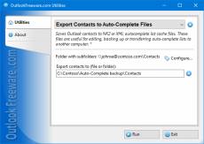 Company: Relief Software Country: United States of America, TX, Houston ASP member: No Company Web site: http://www.outlookfreeware.com Site of program: http://www.outlookfreeware.com Application info: http://www.outlookfreeware.com/en/products/all/outlookautocompleteexportcontacts Author: Outlook Freeware Sales email: info@outlookfreeware.com Support email: info@outlookfreeware.com License type: Freeware Class: Communications::Other E-Mail Tools Specific: Internet Categories: Outlook add-ins, Outlook addins, Outlook addons, Outlook Add-ons, Microsoft Email Add-ins, Office add-ins, E-Mail add-ins, E-Mail addins, E-Mail add-ons, E-Mail addons, E-Mail Tools, E Mail Tools, Mail Tools, Mail Utilities, Email, Работа с почтой, Почта, Email-Software, Internet & Network, Internet, Интернет, Outlook, E-Mail, Email - Miscellaneous, Communications, Интернет & сеть Platform: Windows OS: Win2000, WinXP, Win7 x32, Win7 x64, Windows 8, Windows 10, WinServer, WinOther, WinVista, WinVista x64 System requirements: Microsoft Office Outlook 365/2021/2019/2016/2013/2010/2007 Language: English, Russian Limitations: