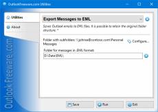 Keywords: free, freeware, outlook, add-in, add-on, save, eml, backup, messages, files Free and easy way to export messages from specified Outlook folders to EML format files. It is possible to retain the original folder structure. Microsoft Outlook cannot export messages preserving source folder structure. This utility allows solving this problem. Specify target folder for files in EML format, source Outlook folder(s) and run the utility. You will get all your exported messages placed according to the source folder structure. This utility can also be used to export messages to Windows Live Mail, Mozilla Thunderbird and other email clients that recognize emails files in EML format. The product provides both standalone application and Outlook add-in.