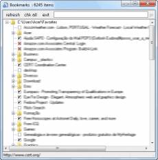 Bookmark manager to help you manage all your Internet Explorer favorites and links. Checks all 'favorites' automatically - or one at a time - for existence and changes, and marks links that are no more as such for later checking or deletion at will. You can rename the 'favorite' (link) name, change URL link, change all properties. Lauches links to your browser directly and assists in organizing 'favorites' and hiperlinks easily, if you want. Very small utility. Saves all links to disk for later browsing too, fast and trouble free.