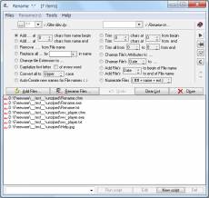 Keywords: File, Renamer, Name, Date, Numerate, Batch, Extensions, String, Convert, Characters, Replace, Directory, Free, Freeware File Renamer will let you rename all your files and folders, but with a lot more options. You can batch rename all files, add string to beginning or end of filenames, remove string from all the names to rename, change all the file extensions, numerate all filenames sequentially, convert all to uppercase / lowercase, trim 'x' characters from beginning or end of filenames, replace spaces inside filename to underscore or eliminate all spaces, replace one string from the name with any other, and some more... Can work with one or multiple directories, remove or add individual items from file list. Select multiple files from Open dialog box. Suports Drag and Drop from Explorer. Also has unlimited 'undo' function for all past renames done.. Remembers last renaming strings, and new file extensions can be added to be used next time. Accepts command line filenames and a explorer context menu can be created so that you can right click on Explorer and directly send the selected files and folders to be renamed to the program window. You can also create 'scripts', combining several options to be applied in one go, so effectively creating brand new options to rename all your files.