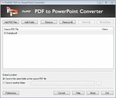 Company: FirePDF Corporation. Country: United States of America, FLORIDA, SANFORD ASP member: No Company Web site: http://www.firepdf.com Site of program: http://www.firepdf.com/pdf-to-powerpoint.html Application info: http://www.firepdf.com/pdf-to-powerpoint.html Author: FirePDF PDF Converter Sales email: pdfconverter@firepdf.com Support email: pdfconverter@firepdf.com License type: Shareware Class: Graphic Apps::Converters & Optimizers Specific: Graphics Categories: Business & Finance :: Office Tools, Business & Finance :: Utilities, Multimedia and Design :: Miscellaneous Platform: OS: Win2000, Win7 x32, Win7 x64, Win98, WinServer, WinVista, WinVista x64, WinXP System requirements: NA Language: English Limitations: NA