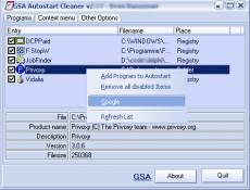 Keywords: autostart, autorun, cleaner, clean, deleter, context menu, delete, remover, remove, autostart clean, autostart remove, autostart delete Did you ever wonder why it takes so long until your computer starts up? Did you ever wonder why so many programs load when you turn your pc on? Did you ever wonder why everything is so slow or why you leak of available memory? Get rid of these useless programs. With GSA Autostart Cleaner you can. It will search all places in your operation system where applications leave their autostart entries (registry, ini-files, bat-files, autostart-menus,...). Then you can choose if one is really needed or if it can be deleted. This speeds up the whole boot process and finally resulting in a more stable system. Autostart Cleaner finally makes it easy for everyone to clean up his PC. In addition you can also clean the unwanted entries in the context menus from your explorer.