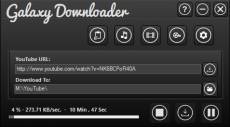 Keywords: YouTube, Youtube Downloader, Downloader, Video, Video Converter, Audio, Audio Extractor. Galaxy Downloader is the all-in-one, 1-2-3 YouTube downloader. Easy Drag & Drop videos from YouTube with many user friendly functionality like Stop, Pause, Resume, Queue and download status. Downloads Shows % downloaded, Speed and Time remaining. Galaxy Downloader can Extract audio from downloaded YouTube videos with quality selection into mp3. Converting Downloaded videos to other formats or mobile devices is easy implemented by choosing from configure format and quality selection. Galaxy Downloader comes with an easy and simple modern interface