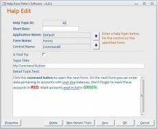Company: Peter's Software Country: United States of America, CA, Los Angeles ASP member: No Company Web site: http://www.peterssoftware.com Site of program: http://www.peterssoftware.com Application info: http://www.peterssoftware.com/hlp.htm Author: Peter De Baets Sales email: info@peterssoftware.com Support email: info@peterssoftware.com License type: Demo Class: Development::Help Tools Specific: Categories: Programming :: Help Authoring Tools, Programming :: Databases & Networks, Programming :: Visual Basic, Programming :: Components and Libraries Platform: OS: Win2000, WinXP, Win7 x32, Win7 x64, Windows 8, WinServer, WinVista, WinVista x64 System requirements: Microsoft Access 2000 or later. Language: English Limitations: Nag messages appear.