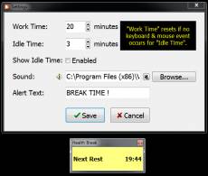 Keywords: health, break, time out, healthcare, relax, eye, eyecare We all work too much. Many don't realize how important it is to step away from the monitor and take a break. This isn't just for your physical health, but your mental health. For some users breaks come naturally. For others, a bit of a heads up is necessary. Health Break is a 'take a break reminder' software for long-time computer users. You do not have to test the limits of your eyes, your hands, or your sanity. Use Health Break to ensure you take a break during long days of computer usage.