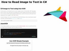 Auto OCR वर्ग एक .NET क्लास है जो OCR को कोड की एक लाइन में प्राप्त करने की अनुमति देता है। यह बहुत ही कम सेटअप के साथ C# .Net में छवियों से पाठ पढ़ सकता है, और आयरन OCR स्वचालित रूप से एक छवि से निकाले जाने के लिए एक अच्छा OCR संचालन और स्वच्छ पाठ के लिए आवश्यक सभी सही कॉन्फ़िगरेशन और छवि सफाई ऑपरेशनों में सबसे अच्छा अनुमान लगाएगा।