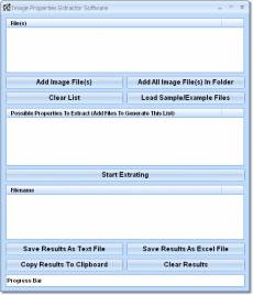 Keywords: png image property extract, extract jpeg file properties, camera model, date taken, extract dimensions from multiple pictures, photo data extraction, image metadata getter, image information harvest, pull, pull out, data, get metadata from pics This software offers a solution for users who want to extract image property data from one or more PNG, JPG, TIF, BMP and GIF files. The software allows choice of properties for extraction. The user simply adds image file/s or an entire folder for processing and the software displays a list of available properties. Using check boxes, the user selects the required properties before starting the extraction. The resulting data can be saved as a text or Excel file or copied to the clipboard for pasting. Sample images are included with the software as an aid to new users. Using this time saving software, extracting property data from large numbers of files takes just one click.