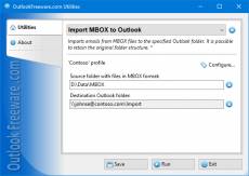 Keywords: free, freeware, outlook, add-in, add-on, import, mbox, messages This free utility imports email messages from MBOX files into Outlook. It supports various formats of MBOX files: mboxo, mboxrd, mboxcl, mboxcl2, and others. MBOX message database format is used by many mail systems for Unix, Linux and Apple Macintosh, and by some mail clients for Windows, such as Mozilla Thunderbird and Eudora. This program quickly transfers emails from MBOX to Outlook. It can import MBOX files from multiple subfolders, preserving the folder structure. When importing, the utility stores in original Internet headers in Outlook messages. In addition, it can automatically move successfully imported MBOX files to another folder, allowing you to run the import several times, without creating duplicate messages. The command line gives you the ability to use the utility in many scripts and scenarios, for example, when you automate the migration of MBOX files for many users.