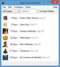 Keywords: calendar, countdown, holidays, share, special events Judy's CountDown is a polished, fun program that helps you track holidays and other important events in your life. It gives you a running count of the days left before your events, so you can be sure not to forget about something crucial (like your wedding anniversary!) ... and you can share events with people you know. Comes with numerous predefined events (such as Easter, Mother's Day, change smoke alarm batteries, etc.) and attractive icons, plus you can define your own events and create your own icons from your own photos at the click of a button. Predefined events are automatically kept up to date as they change from year to year, and you can selectively share events with people you know, or subscribe to their own event publications. Ideal for family birthdays, sports team games, activities with your friends, and so forth. You can use Judy's CountDown FREE, or optionally pay for extra storage for more events, icons, subscribers, etc.