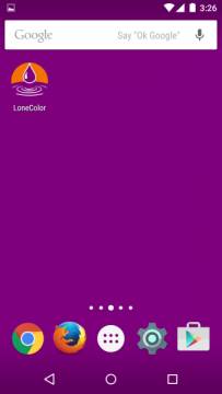 Keywords: color, wallpaper, color wallpaper, smartphone, tablet, random, color code, screen, background, battery, faster, free Tap the LoneColor icon to instantly set a beautiful color as your cool, modern and elegant wallpaper. LoneColor brings an infinite palette of tints to your Android smartphone or tablet. LoneColor is a zero interface app: just tap its icon and instantly see the wallpaper change to a surprising random color. Or copy one of the millions of color codes from a color loving community on the Internet, or from any other app, and tap LoneColor to see it instantly fill your screen. (Try #D31996, FF9900, or red). Color wallpapers may be a welcome and relaxing change from the traditional photo wallpapers. LoneColor wallpapers also free up valuable memory, consume less battery, and make your device run faster. If the random color wallpaper is not to your taste, and because LoneColor is so 'instant' and easy to use, you can keep tapping its icon until you are satisfied with the result. And you can refresh your color wallpaper as often as you like. As a zero interface app (without any texts, buttons or settings), LoneColor gives you feedback using the... Clipboard. Just go and paste anywhere to get the color code of the random wallpaper, or any (unlikely) error messages. LoneColor is completely free and open source, without ads or Internet permissions.