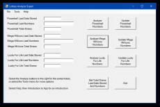 Lottery Analyzer Expert analyzes the historical data for the Powerball, Mega Millions and Lucky For Life lottery games. It adds up the totals for the drawn numbers, sorts them, and displays them to the user. It does this for both Powerball, Mega Millions and Lucky For Life. The user selects the number of draws to sort back from the most recent stored date. The application doesn't pick the numbers for the user. It lets the user see the sorted totals, from the least drawn to the most drawn. The user can then pick his/her own numbers from the results. There is also a Tools menu option for a Complete Analysis that sorts the data using some predefined rules. The application lets the user update their input files with new dates and numbers for the most recent draws. Each user on the computer has access to all input and output files, as they are stored in a folder in My Documents. The application also has the options to update the input files to the application from the web. Also added are the options to find the matching combinations in the numbers history, finding the best combinations to play, and entering numbers to check for matches.