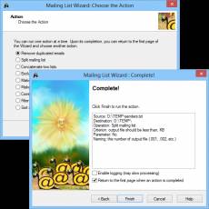Keywords: email, addresses, mailing list, remove duplicates, process emails, lists merge, emails syntax Mailing List Wizard (MLW) MLW is designed to help you with processing and converting your mailing lists. It is able of excluding duplicated addresses, correcting misspelled addresses using unique algorithms, filtering lists by varied criteria, merging lists, and making exclusions from address lists using an additional list. MLW can supplement mailing lists with address owner names using information from other lists, delete address owner names from mailing lists, and also many other things. MLW is a single software product that combines functions of several programs for mailing list processing.