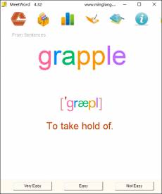 Keywords: English words, vocabulary, phonetics, pronunciation, flash card, remember, recite The MeetWord help Chinese, Korean, Japanese and other people learn English Words more efficiently. Repeat on suitable time according to user's learning history. Phonetics: Kenyon and Knott, the International Phonetic Alphabet (IPA). Clear pronunciations. 18000 English words, 4000 English definitions, 15000 Sample sentences. GRE wordlist, TOEFL wordlist, SAT wordlist, IELTS wordlist, 5000 most frequently used American English words list. Simplified Chinese translations, Traditional Chinese translations, Korean translations, Japanese translations of English words. The program can find original words as user's course from a text. For example, the program can find 'wife, meet, meeting, sell' from a text: 'wives, meeting, asdfg, sold'. Efficient learning modes: Pairing words with translations, Pairing words with example sentences, Moving the letters to form the complete spelling, Inputting a letter, recalling the meaning by spelling, recalling the English word by a translation, recalling the spelling and translation by a pronunciation, recalling the English word by a pronunciation and a sample sentence or a definition.