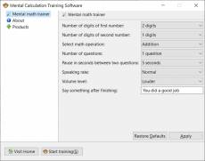 Keywords: practice mental math software, practice mental arithmetic program You can use this mental arithmetic software to easily improve your math skills! You don't need to be a genius, just use this software for some calculation training This math mental Calculation Training app designed for primary and middle school students Software written in native programming language for mental arithmetic training. Use customizable number of digits for mathematical addition, subtraction, multiplication and division If you don't want to waste paper to practice mental arithmetic, and you dont want to stare at a screen that may harm your eye health, then this software is perfect for you