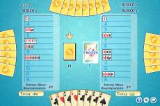 Pouvez-vous démontrer le travail d’équipe intelligent et utiliser les atouts à bon escient? Dans ce jeu à 4 joueurs, votre but est de faire des canastas complètes, c’est-à-dire des ensembles d’au moins 7 cartes similaires, puis « sortir ». 2 jeux de cartes à jouer et 4 jokers seront utilisés dans le jeu, et deux joueurs s’asseyant l’un en face de l’autre deviendront des coéquipiers tels que 2 partenariats sont créés. Au début d’une manche, le donneur distribue une par une 11 cartes à chaque joueur, puis 1 carte retournée sera distribuée au rebut dans le milieu de l’écran, et les cartes cachées restantes constitueront le talon sur la gauche du rebut. 2 tableaux se trouvent sur les deux côtés de l’écran, et les deux équipes peuvent poser les cartes légitimes sur les tableaux. Toutes les 3 ne peuvent pas être utilisées pour faire des canastas, et si un 3 rouge sont distribués à un joueur, elle sera automatiquement déplacée au tableau correspondant de l’équipe, et une autre carte sera distribuée au joueur. Avant d’étaler des canastas, vous devez utiliser vos cartes pour faire des brelans, c’est-à-dire 3 ou plus des cartes de même rang. Les 2 et les jokers sont des atouts, et un brelan peut comprendre au plus 2 atouts et au moins 2 cartes ordinaires. Notez que les tous premiers brelans étalés par une équipe doivent respecter l’exigence initiale comme montrée en bas du tableau de l’équipe, qui est 50 points au début de la partie. Dans chaque brelan, toutes les 4, 5, 6 et 7 valent 5 points; tous les 8, 9, 10, V, D et R valent 10 points; toutes les As et 2 valent 20 points; et chaque joker vaut 50 points.