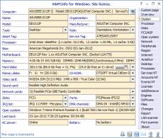 Keywords: system, hardware, software, inventory, service tag, BIOS, CPU, sysinfo, drives, memory, motherboard, IP, MAC, processor, service, processes MvPCinfo collects information about computer's hardware and software. Main features are: compact size (~800K); it doesn't require installation on the workstations and can be run from floppy, network drive or from domain login script; it can work hidden; it doesn't give troubles for clients (no reboots, no DOS-windows); affordable prices (all licenses allow using product on unlimited number of machines); 2-years free upgrade period. It allows to perform automatic hidden inventory of whole network in easy-to-use manner. Specific information includes computer ID, model, manufacturer, service and asset tags, processor, BIOS, memory, CD-ROM, disks, video, sound, network, modem, motherboard, monitor, mouse, printers, IP, MAC and E-mail addresses, shared and mapped devices, operating system, running processes, services, active TCP connections, internet visits history, installed licenses and software. Any number of custom fields can be added to reports. You can print report or save it as TXT, CSV, HTML, XML file or any other using report templates.LAN and Port scanners, S.M.A.R.T reader and File Recovery tool are enclosed.