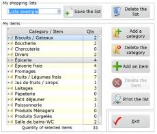 Keywords: Shopping list management, organize your shopping list, free software This free software allows you to manage and print your shopping lists. Shopping lists are organized into categories of items. You can create as many item categories as you want, each categorie can contain as many item as you want. My shopping list software is very simple to use, you just have to select all item you have to purchase and open the print preview to check that you shopping list is complete. For each item you can also choose a quantity. A search feature allow to find easily an item in your list.
