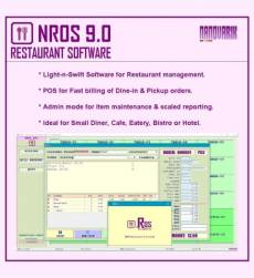 Keywords: NRos, Restaurant, POS, Billing, App, Software NRos 9.0 Restaurant is Light-n-Swift Software for Order, Billing & Management of Small Restaurant, Hotel or Diner. Key-Features: FOR Very Small Cafe, Eatery, Bistro, Restaurant IDEAL For Home-Based-Catering TOTAL 71 Features (Modules, 25 Reports, Options) LITE Installation; Installs in 2-3 Minutes PC/Laptop/Desktop/Windows Software Restaurant Management, Items, Staffs/Chefs Generate Table/Pickup Bills, Receipts POS-Screen for Orders & Billing Admin-Screen for Reports & Maintenance Secure, Offline, Fast Transactions Items, Customers, Suppliers, Staffs, Coupons Billing, Purchase, Pays, Accounting Item, Daily, Monthly, Group Sales Balance-Sheet, Labels, Tax Report Groups, Itemnotes, Accounts Restaurant, Users, Help Customization, Preference, Options Print or Save or Email; Receipts & Bills Restaurant App, Billing Software, POS System, Hotel Program