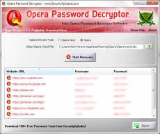 Keywords: opera password recovery, opera password decryptor, opera password cracker, decrypt wand.dat, wand.dat Opera Password Decryptor is the free tool to instantly recover the passwords stored by all versions of Opera browser Like other internet browsers Opera also stores the username/passwords for websites visited by user. Opera stores the passwords along with username, website and other related information in the password file n an encrypted format. OperaPasswordDecryptor can instantly recover all these stored encrypted passwords and show them in clear text format. Features of Opera Password Decryptor ---------------------------------------------- * Instantly decrypt and recover stored encrypted passwords from 'Opera Secret Store' for all versions of Opera * Provides support for recovering stored opera passwords from different system also.User can specify remote system's wand.dat file path to recover the passwords. * Automatically discovers 'Opera Password File' (Wand.dat) based on installed version of Opera. * By default passwords are not displayed in clear text as it is sensitive information. However user can view the same using 'Show Password' option. * On successful recovery operation, username, password along with a corresponding login website is displayed. * Provides option to sort the displayed password list by username, password or website which makes it easy to search through 100's of stored account entries. * User can save the displayed Opera sign-on password list to HTML/XML/Text/CSV file for future use. * Installer for helping you in local Installation & Uninstallation. Opera Password Decryptor works on both 32-bit & 64-bit platforms starting from Windows 2000 to Windows 10